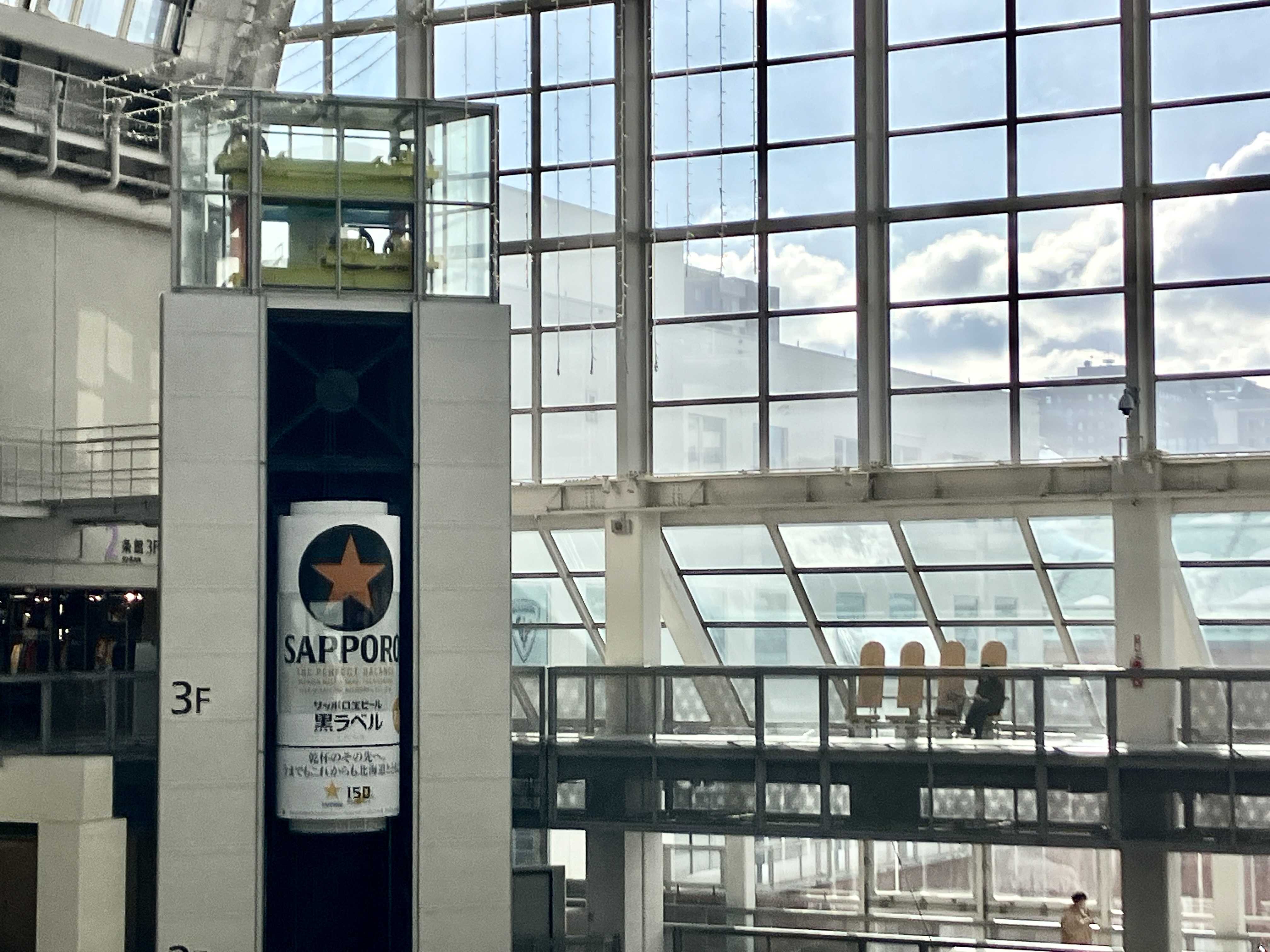 アトリウムのシースルーエレベーターは、期間限定でサッポロビール「黒ラベル」のラッピングが施されています★ まるで大きなビールが動いているようで、写真でも動画でも映えること間違いなしです!