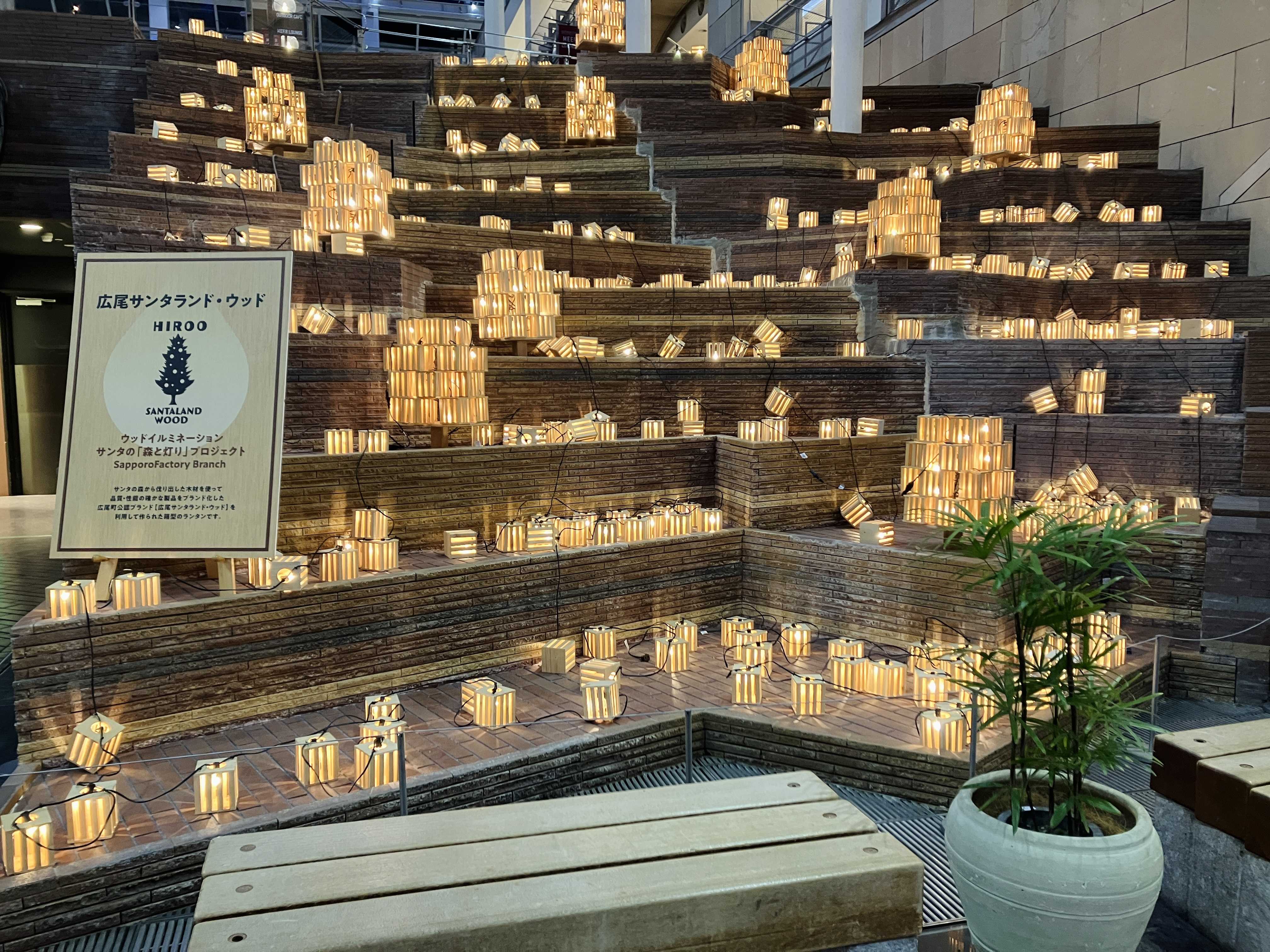 アトリウムの中央階段横にあるウッドランタン。 撮影してみると木の温もりで灯りがほわっとやわらかに写ります♪ 幻想的な様子をぜひ写真に収めてみてください☆