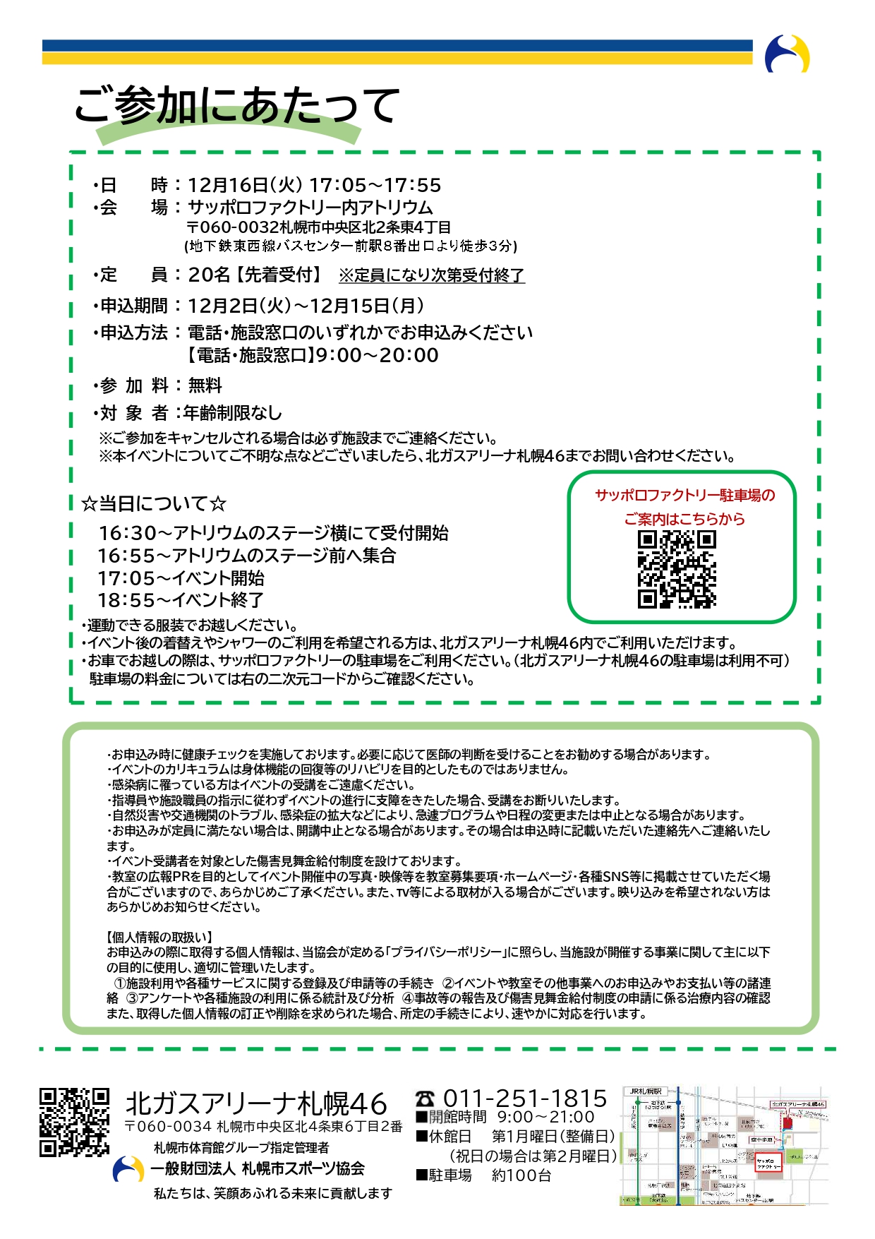 時間:17:05~17:55 料金:無料 主催者:北ガスアリーナ札幌46 お問い合わせ先:011-251-1815