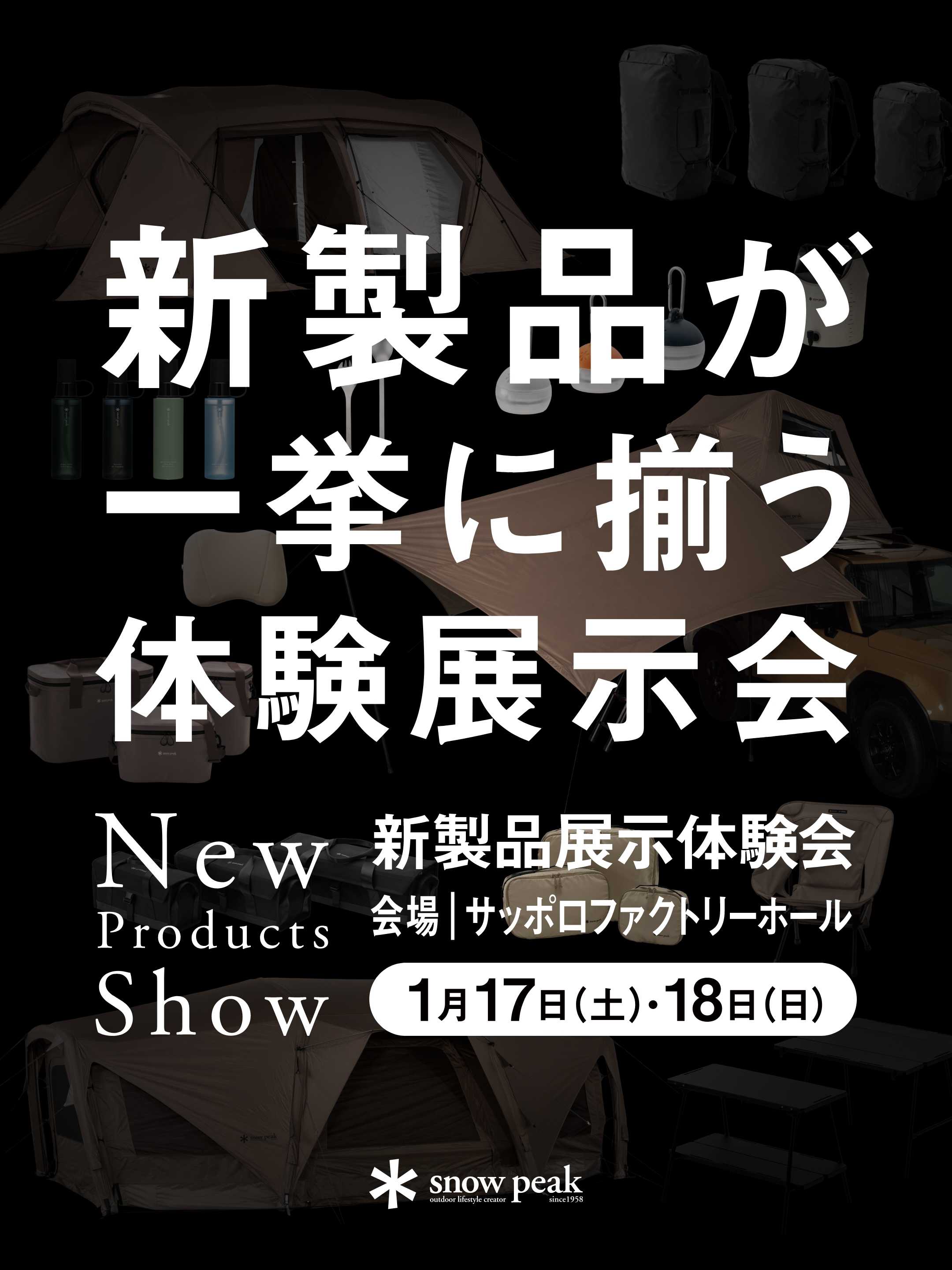 ”New Products Show 2026” を全国8会場にて開催いたします。ご購入を検討されているお客様はもちろん、新製品を一度見てみたいというお客様も、会場のスノーピークスタッフが詳しくご案内させていただきますので、この機会にぜひ会場へお越しください。