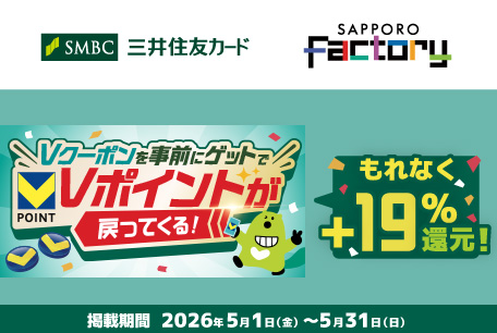5/1(金)~5/31(日) 三井住友カード×サッポロファクトリー Ⅴクーポンを事前にゲットで Ⅴポイントが戻ってくる!もれなく+19%還元