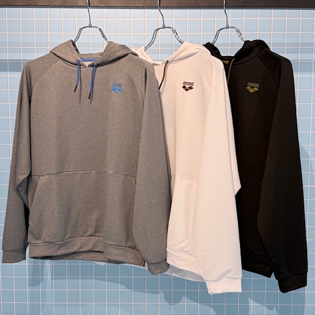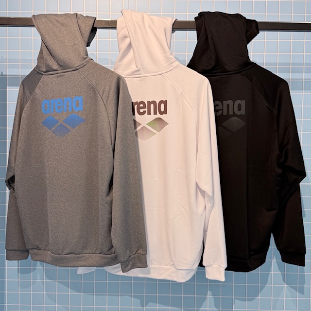 練習や試合の移動着としても、プールサイドの防寒着としても、着用シーンが増えているフード付きスウェットパーカーのご紹介です!