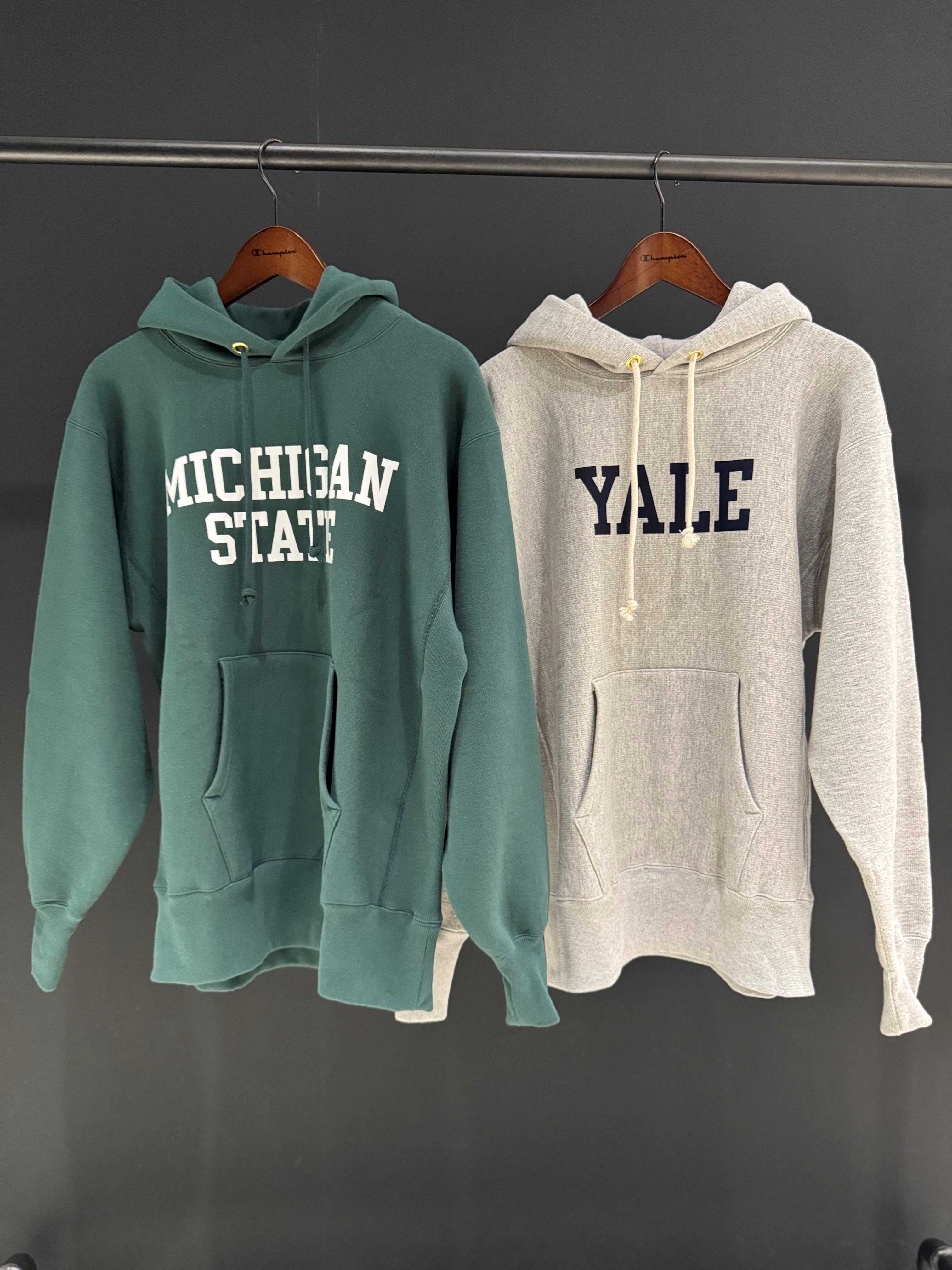 1960年後期より、アメリカの消防法に基づきコットン100%の裏起毛素材が危険と判断され、ポリエステルやアクリル、レーヨンが含まれるようになった経緯がありました。この商品は、その時代を経た1970年後期に使用されていたアクリル混の「REVERSE WEAVE® (リバースウィーブ®)」を復刻したシリーズのフーデッドスウェットシャツです。当時の混率を忠実に再現し、シルバーグレー以外の色はコットン90%・アクリル10%。シルバーグレーのみ表面を杢調の見え方にするためレーヨンを加え、コットン82%・アクリル12%・レーヨン6%としています。旧式のシンカー編み機で編み立てた独特のボリューム感と風合いが特長です。プリントデザインはIVY LEAGUE(アイビー リーグ)のオフィシャルカレッジライセンスに基づいたもので、染み込みプリントによる「YALE (イェール大学)」とラバープリントによる「MICHIGAN STATE (ミシガン州立大学)」の2種類。「MICHIGAN STATE」は当時の書体を採用しています。左袖にCロゴワッペンが付いていない点も当時の仕様そのままです。