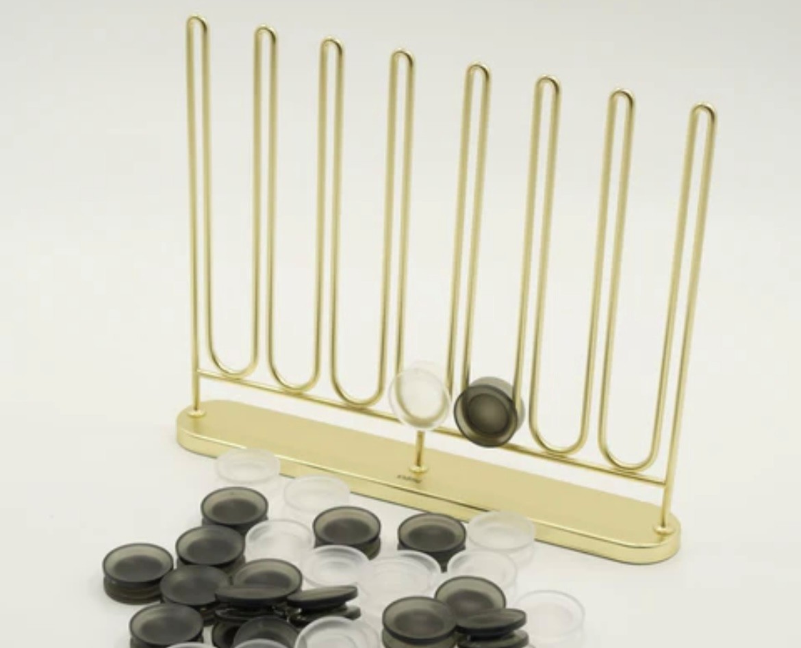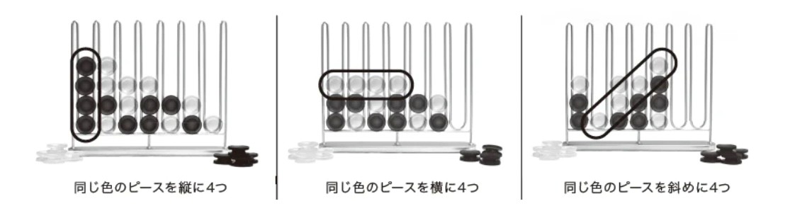 対戦相手と交互にコマをホルダーにいれ、同じ色のコマを4つ先に揃えた方が勝ち、