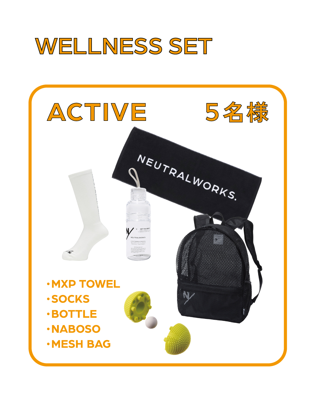 キャンペーン期間中、WHIFFシリーズを含むNEUTRALWORKS.商品を1回のお買い上げ金額が合計¥20,000(税込)以上の方(18歳以上)を対象に、ご応募の中から抽選で、毎日のREADYをサポートする「WELLNESS SET」をプレゼントいたします。
