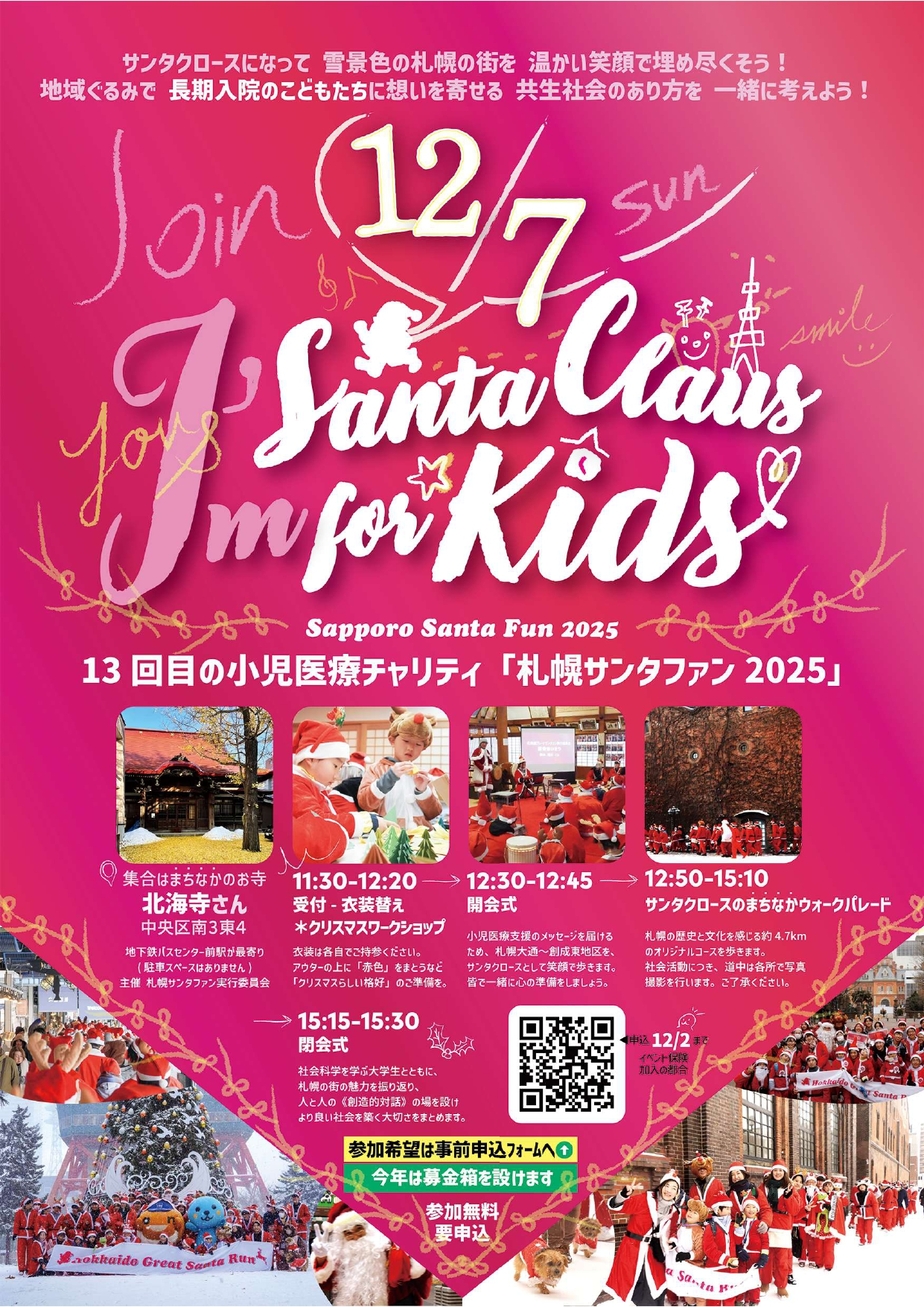 札幌開催13年目となる2025年も、地域のお寺・北海寺さんを拠点に開催。サンタクロースの衣装を持参した様々な年代の参加者が、創成東エリア・大通エリアをぐるっとウォーキングします。このウォーキングパレードや会場に設置する募金箱、企業・団体からの寄付金が、札幌市内の小児医療施設にいる子どもたちへのクリスマスプレゼントになります。