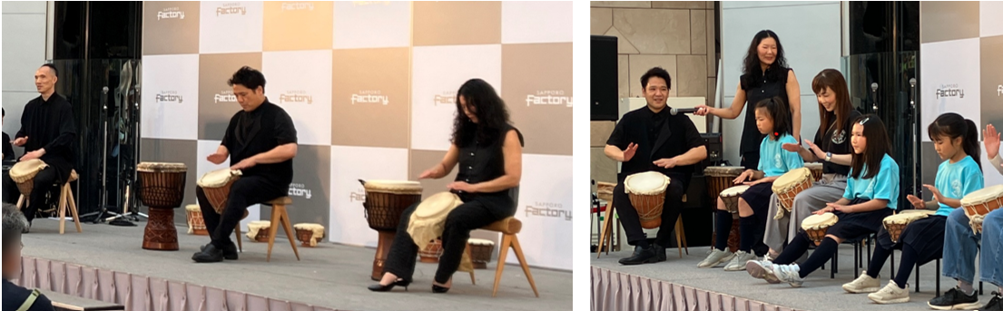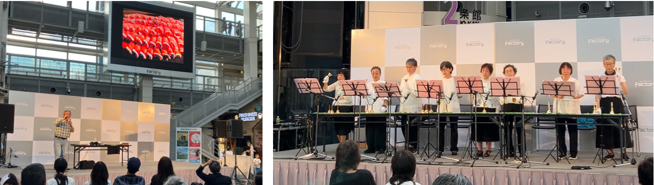 縄文芸術文化財団によるジャンベ・縄文太鼓演奏と体験、芸妓プロモーションによる伝統芸能と撮影会、プロ写真家のスマホ写真講座、コスモスの会のハンドベル演奏といった多彩なパフォーマンスが会場を盛り上げました。