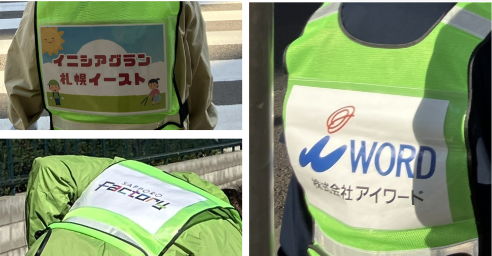 ビブスの背中に記された企業・団体名は、創成イーストエリアで活動する各組織の地域貢献への想いを表しています。それぞれが協力し合い、子どもたちの安全と笑顔を守る活動を通じて、地域の絆を深めています。