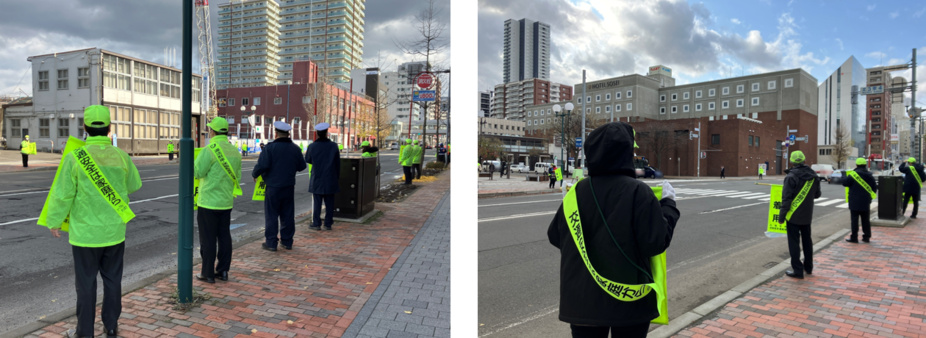 東北連合町内会交通部と東北地区交通安全母の会の主催による『冬の交通安全街頭啓発』が実施されました。当日は東北会館前に町内会や企業の関係者約60名が集合し、サッポロ不動産開発からも6名の社員が参加しました。