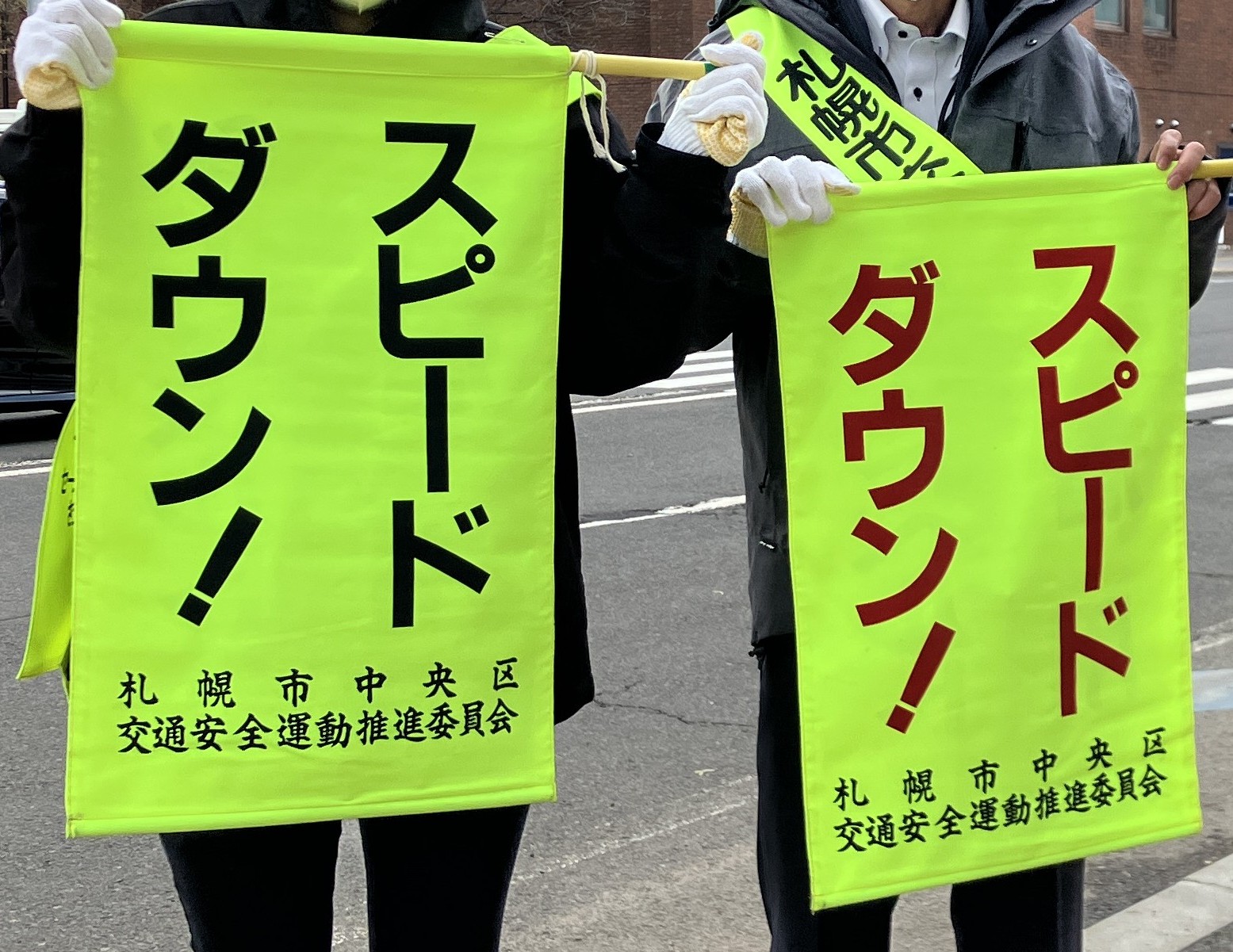 参加者は北3条通りの両サイドに立ち「シートベルト着用」「スピードダウン!」と書かれた旗を掲げながら、走行中の車両や信号待ちのドライバーに向けて交通安全を呼びかけました。