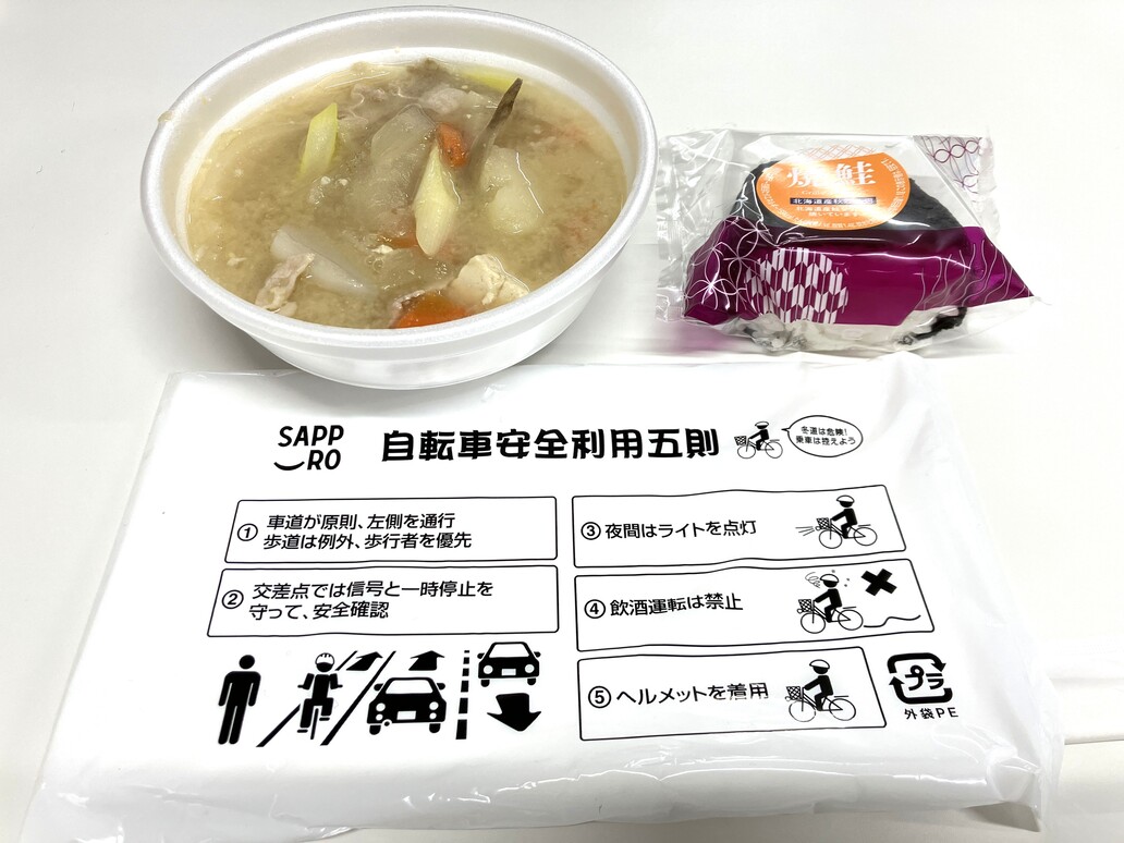 約30分の活動終了後は、東北会館にて東北地区交通安全母の会の皆様が用意してくださった、愛情たっぷりの手作り豚汁が振る舞われました。温かく生姜の風味が効いた具だくさんの豚汁は、冷えた体に染みわたるおいしさでした。